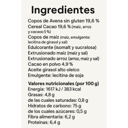 Ingredientes: Copos de avena sin gluten 19,6%, copos de maíz 19,6% (maíz, emulgente: lecitina de girasol y sal), cereal cacao 19,6% (maíz, arroz y cacao 5%), edulcorante (isomalt y sucralosa), extrusionado maíz 7,4% (maíz y sal), extrusionado arroz 7,4% (arroz, maíz y sal), cacao en polvo 4,9% aceite de girasol alto oleico y emulsionante: lecitina de soja.